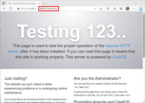 最後に、ブラウザのアドレスバーにhttp://[fd00:10:20:30::101]と、角括弧で囲んで詠唱すれば、CentOSのApacheという神殿にも、光の道を通って参拝できる。