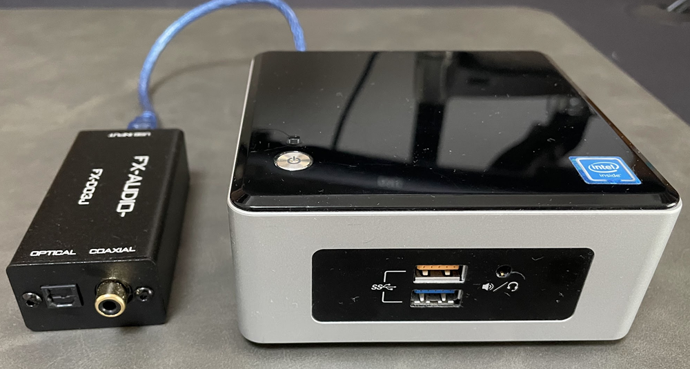 当初はRaspberry PIで儀式を行う予定だったが、PCでも可能と知り、倉庫の奥で埃をかぶっていたIntel Celeron搭載のNUC (NUC5CPYH)を祭壇に選んだ。光の音色を紡ぎ出すため、USB-DDC「FX-D03J」も用意した。