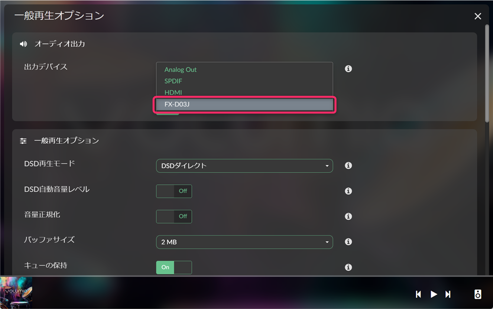 オーディオ出力先を「FX-D03J」に指定し、光の糸を伝って音色を紡ぐよう命じる。